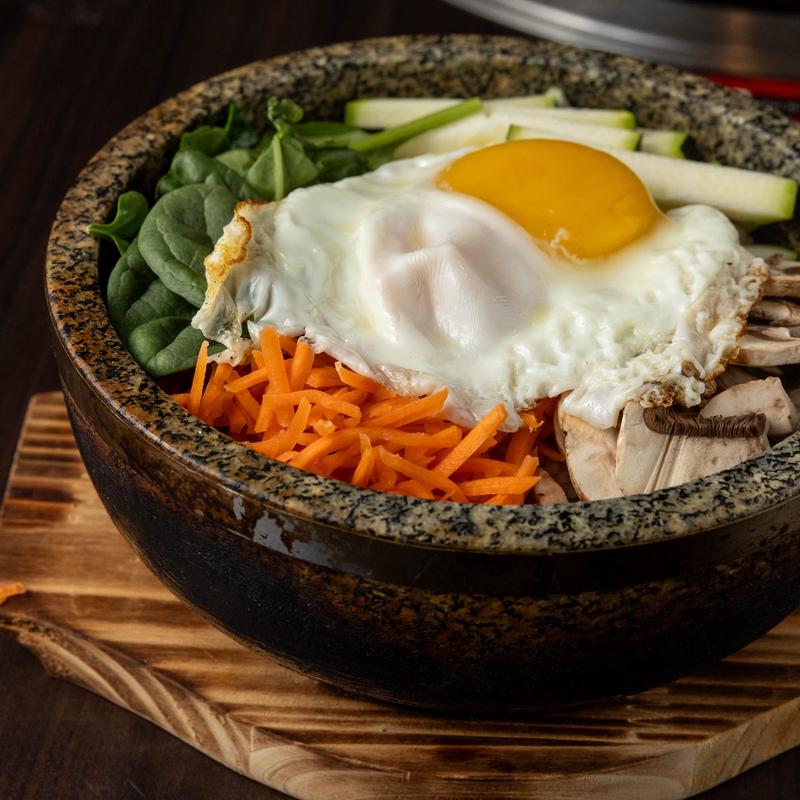 Rice topped with zucchini, mushrooms, carrot, spinach and sunny side up egg | Vegetable $11, Chicken $14, Beef Bulgogi $16
